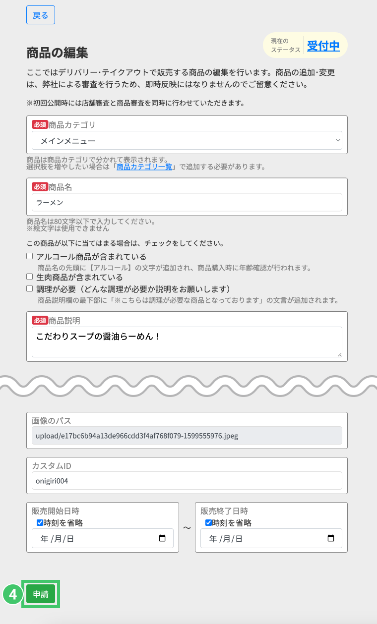 ❹商品の編集ページより、変更したい内容を入力し、一番下の「申請」をタップしてください。