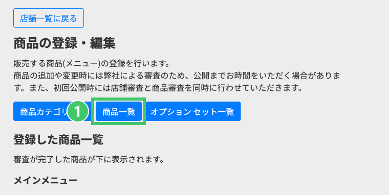 ❶商品の登録・編集ページの「商品一覧」をタップしてください。