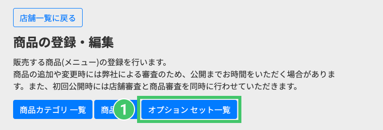 ❶商品の登録・編集ページの「オプションセット一覧」をタップしてください。