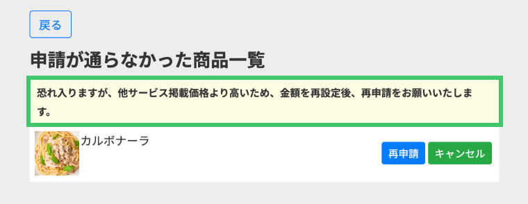 申請が通らなかった商品の上の黄色枠に差し戻し理由が明記されます。