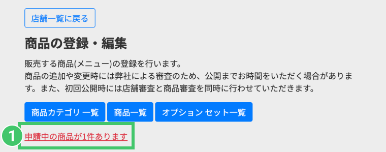 ❶商品の登録・編集ページに「申請中の商品が一件あります」と表示がでます。
