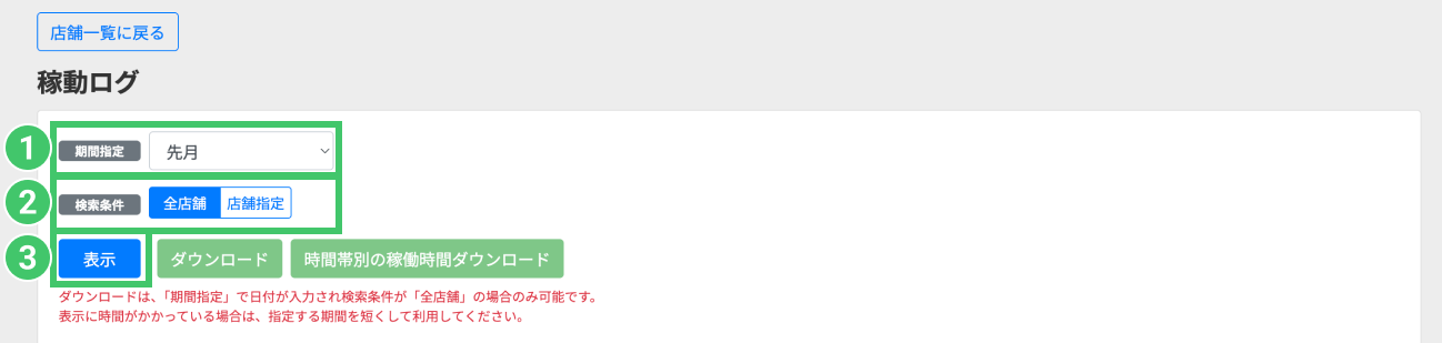❷稼働率を表示したい店舗を「検索条件」で指定します。(全店舗/店舗指定)