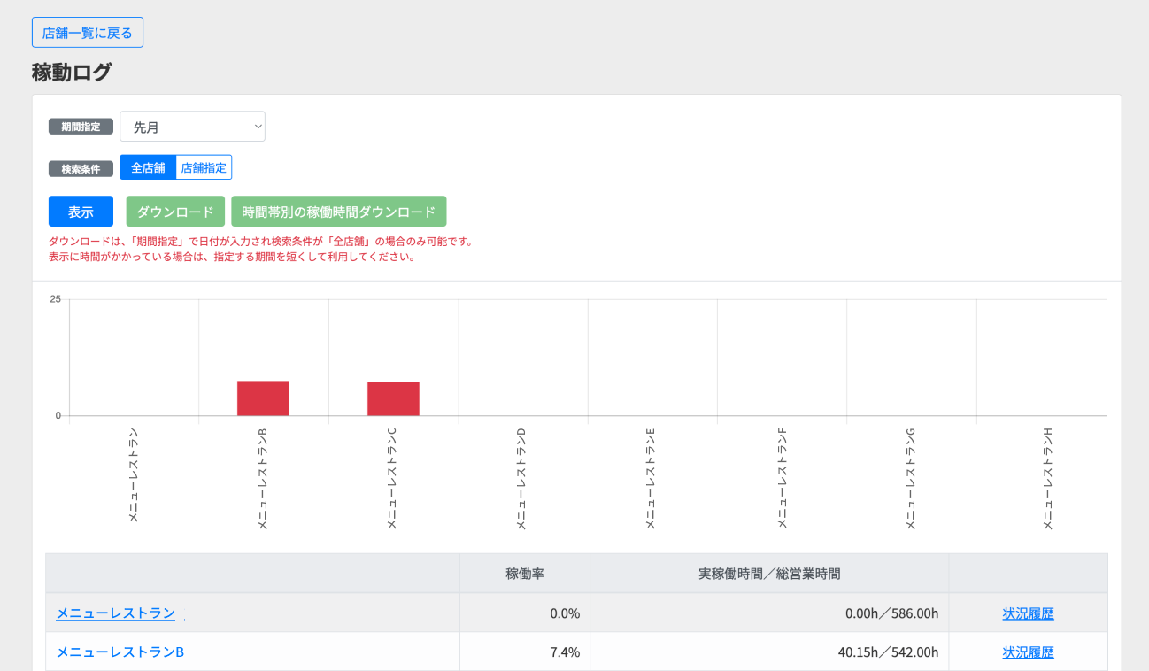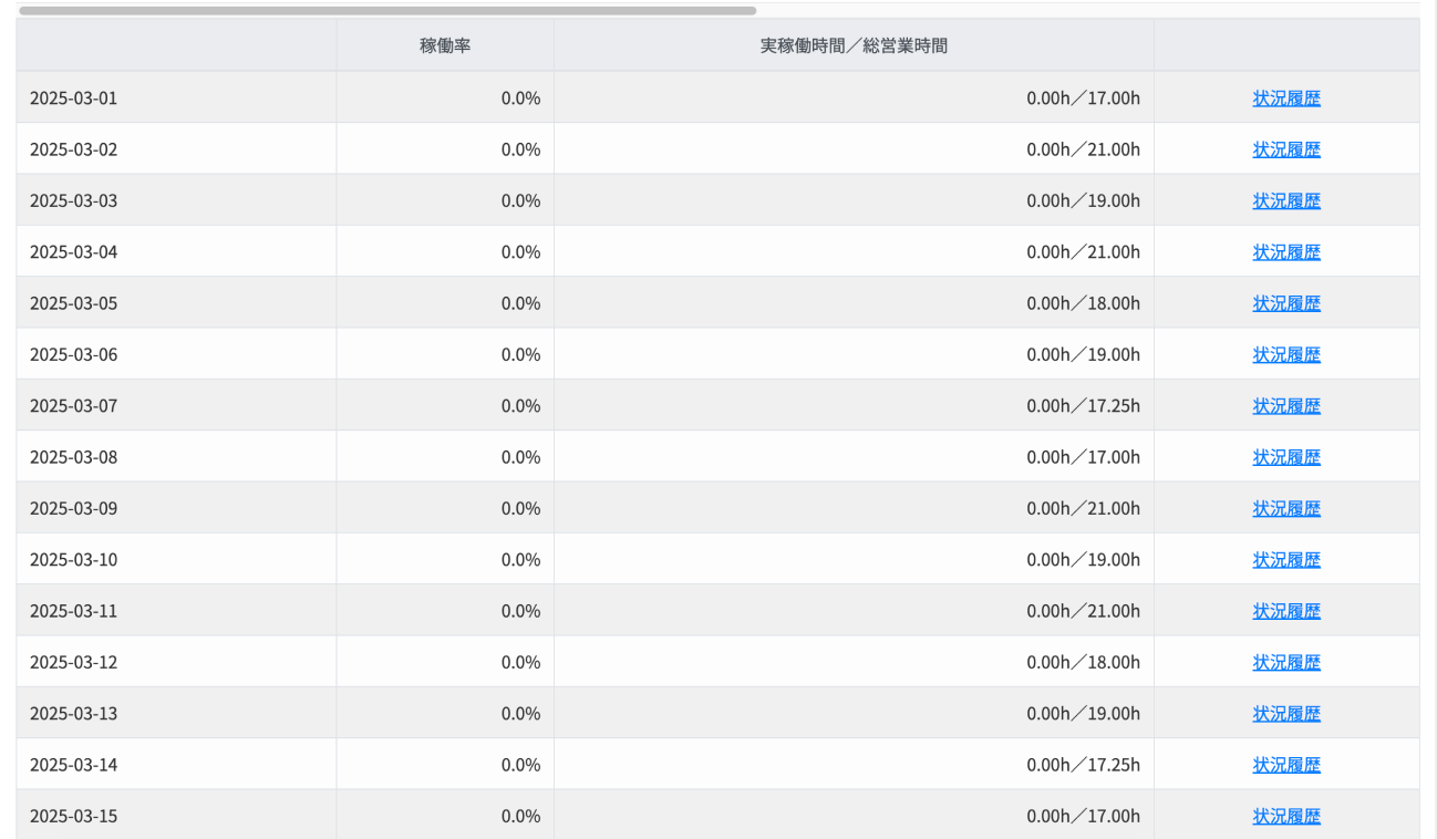 ※状況履歴のボタンをクリックすると、該当店舗において設定した期間の稼働記録が確認できます。