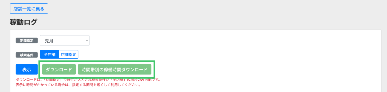 期間を設定後、「ダウンロード」、または「時間帯別の稼働時間ダウンロード」ボタンをクリックします。