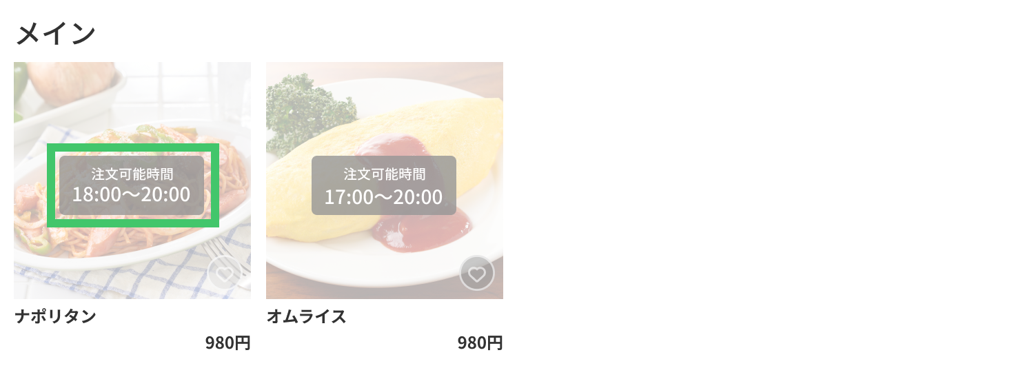 「ランチメニュー」「ディナーメニュー」等時間帯別での設定も可能です。
