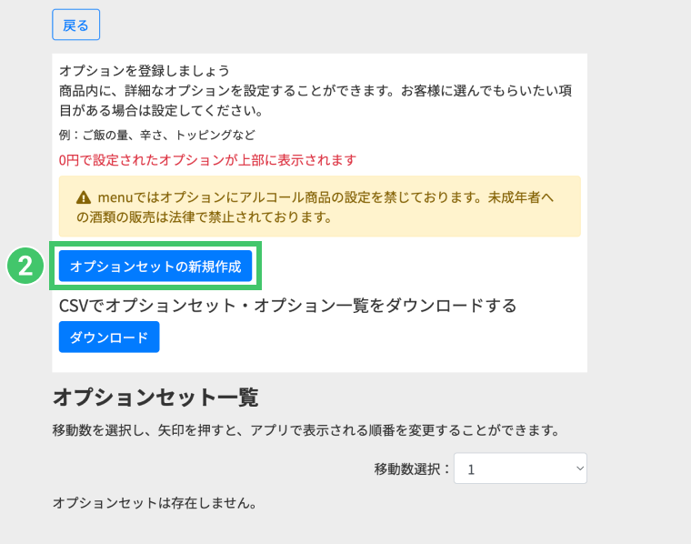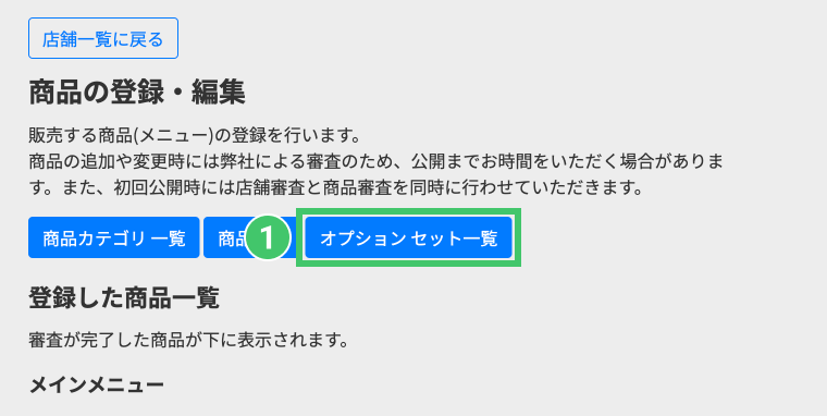 ❶商品の登録・編集画面の「オプションセット一覧」をタップしてください。