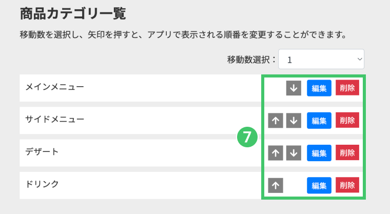 登録されたカテゴリ名の❼右側の矢印よりカテゴリの表示順を変更できます。