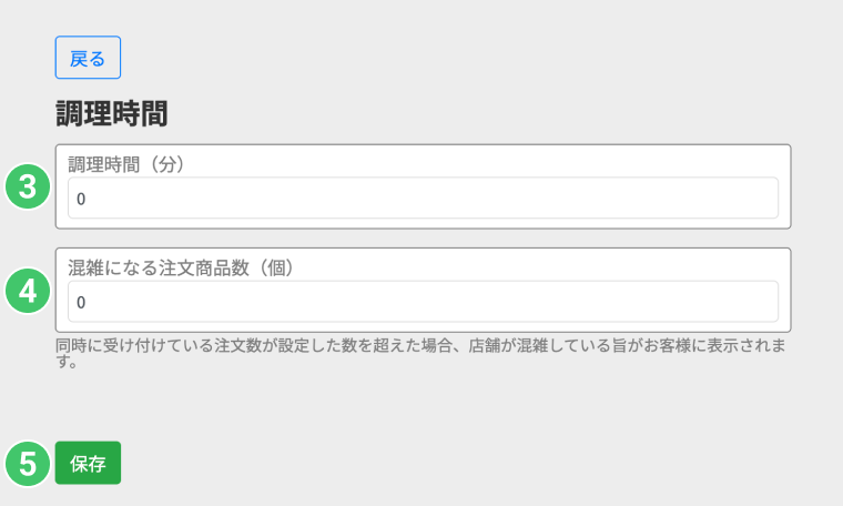 注文受付から調理完了までにかかる平均時間を設定してください。 (設定した時間に+3分加えた時間が表示されます。)