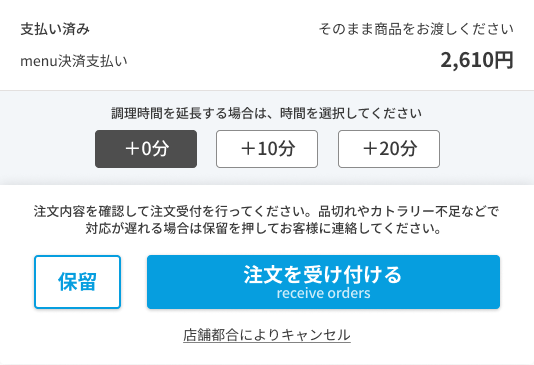 また混雑になる注文商品数の設定をすると店舗アプリ上で調理時間の延長を選択することが出来ます。