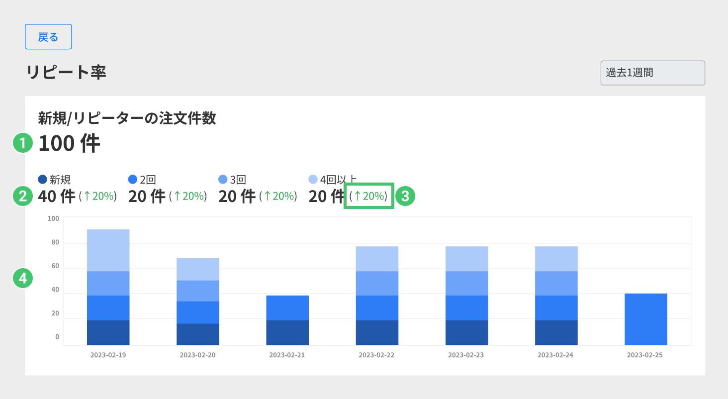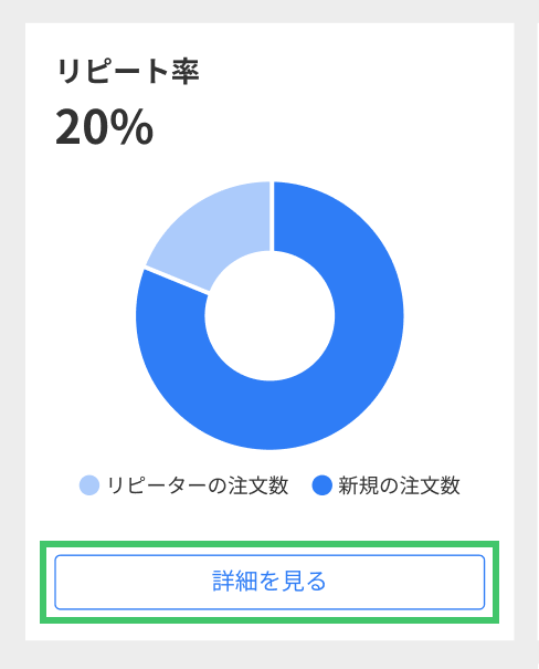 選択した期間内の新規・リピーターお客様の注文件数とその割合が表示されます。