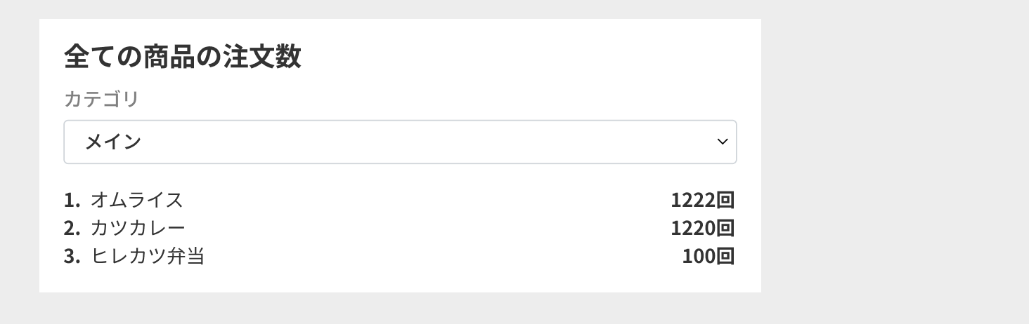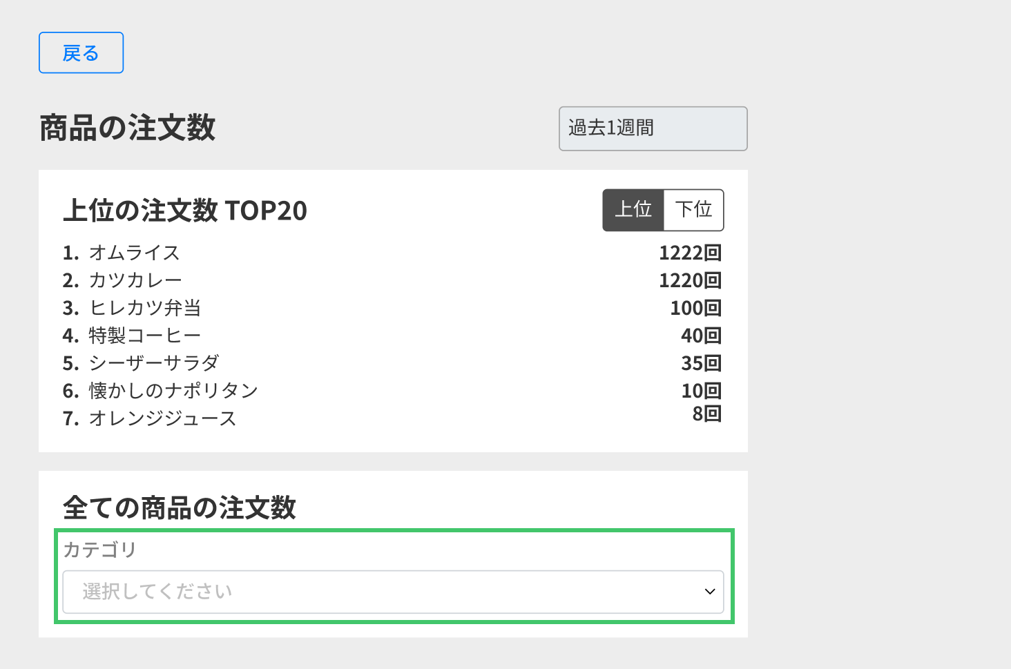 全ての商品の注文数の「カテゴリ」を選択すると、選択されたカテゴリ内の注文された件数の多いTOP20商品が表示されます。