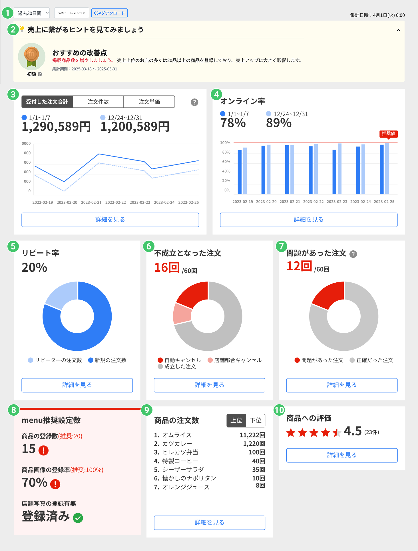 menuが推奨している店舗や商品登録基準に対し、店舗様の現在の登録状況が表示されます。