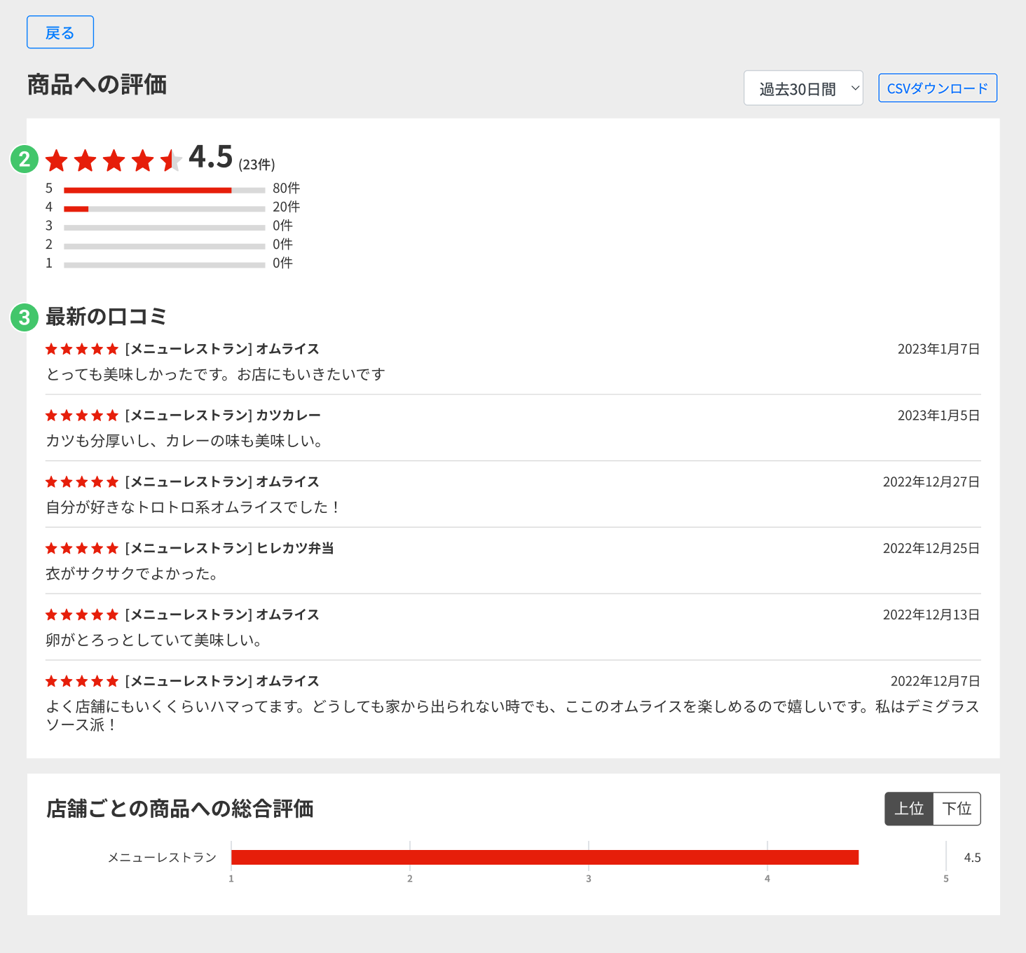 ❷指定した期間内の商品の評価と点数別の件数が表示されます。