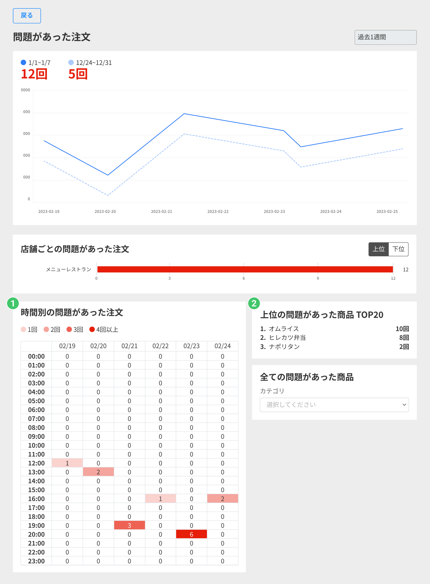 選択した期間内の総注文件数の内、問題があった注文件数と割合が表示されます。