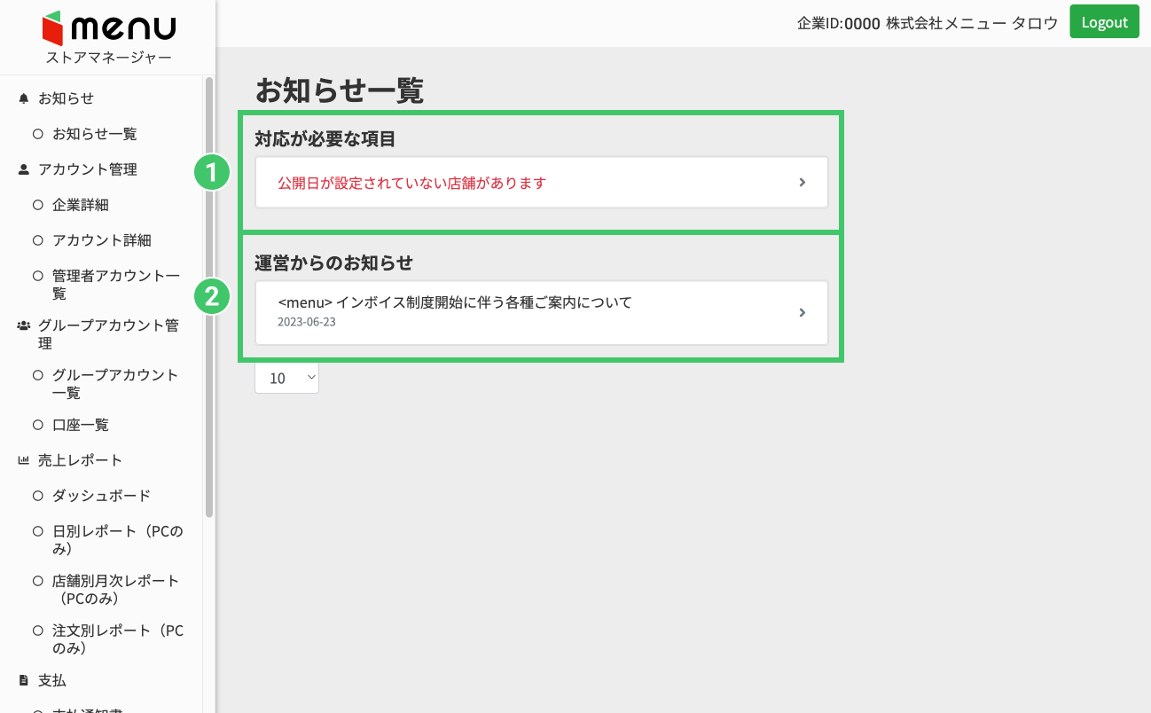 利用規約の変更など、運営からの重要なお知らせが表示されます。
